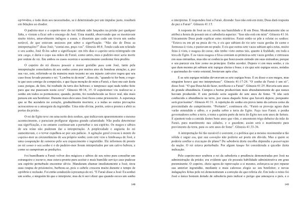 Pelo copeiro-mor soubera o rei da sabedoria e prudência demonstradas por José na administração da prisão ; era evidente que ele possuía habilidade administrativa em grau preeminente . O copeiro , cheio agora de reprovação a si mesmo , esforçava-se por reparar sua anterior ingratidão , mediante o mais caloroso elogio ao seu benfeitor ; e novas indagações feitas pelo rei demonstraram a correção do que referia ele . Em todo o reino foi José o único homem dotado de sabedoria para indicar o perigo que ameaçava o país , e o