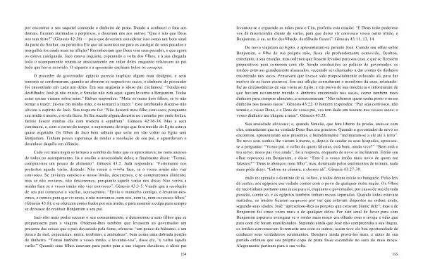 O proceder do governador egípcio parecia implicar algum mau desígnio , e seus temores se confirmaram , quando ao abrirem os respectivos sacos , o dinheiro do possuidor foi encontrado em cada um deles . Em sua angústia o idoso pai exclamou : “ Tendes-me desfilhado ; José já não existe , e Simeão não está aqui ; agora levareis a Benjamim . Todas estas coisas vieram sobre mim .” Rúben respondeu : “ Mata os meus dois filhos , se to não tornar a trazer ; dá-mo em minha mão , e to tornarei a trazer .” Este arrebatado discurso não aliviou o espírito de Jacó . Sua resposta foi : “ Não descerá meu filho convosco ; porquanto seu irmão é morto , e só ele ficou . Se lhe sucede algum desastre no caminho por onde fordes , faríeis descer minhas cãs com tristeza à sepultura ”. Gênesis 42:36-38 . Mas a seca continuou , e , com o correr do tempo , o suprimento de trigo que fora trazido do Egito estava quase esgotado . Os filhos de Jacó bem sabiam que seria em vão voltar ao Egito sem Benjamim . Tinham pouca esperança de mudar a resolução de seu pai , e aguardavam o desenlace daquilo em silêncio .