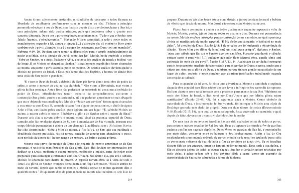 “ E viram o Deus de Israel , e debaixo de Seus pés havia como uma obra de pedra de safira , e como o parecer do céu na sua claridade .” Não viram a Divindade , mas viram a glória de Sua presença . Antes disso não poderiam ter suportado tal cena ; mas a exibição do poder de Deus , infundindo-lhes temor , levou-os ao arrependimento ; estiveram a contemplar Sua glória , pureza e misericórdia , até que puderam aproximar-se mais dAquele que era o objeto de suas meditações . Moisés e “ Josué seu servidor ” foram agora chamados a encontrar-se com Deus . E , como devessem ficar algum tempo ausentes , o chefe designou Arão e Hur , auxiliados pelos anciãos , para agirem em seu lugar . “ E , subindo Moisés ao monte , a nuvem cobriu o monte . E habitava a glória do Senhor sobre o monte de Sinai .” Durante seis dias a nuvem cobriu o monte , como sinal da presença especial de Deus ; contudo , não fez revelação alguma de Si , nem comunicação de Sua vontade . Durante este tempo Moisés permaneceu à espera de um chamado à audiência com o Altíssimo . Havialhe sido determinado : “ Sobe a Mim ao monte , e fica lá ”; e , se bem que sua paciência e obediência fossem provadas , não se tornou cansado de esperar nem abandonou o posto . Este período de espera foi-lhe um tempo de preparo , de íntimo exame próprio .