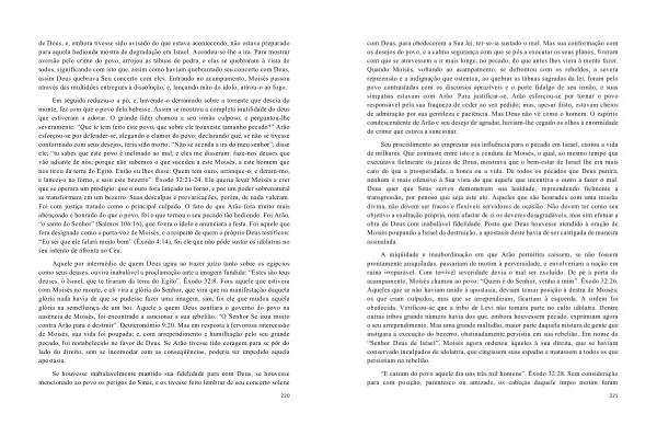 com Deus , para obedecerem a Sua lei , ter-se-ia sustado o mal . Mas sua conformação com os desejos do povo , e a calma segurança com que se pôs a executar os seus planos , fizeram com que se atrevessem a ir mais longe , no pecado , do que antes lhes viera à mente fazer . Quando Moisés , voltando ao acampamento , se defrontou com os rebeldes , a severa repreensão e a indignação que ostentou , ao quebrar as tábuas sagradas da lei , foram pelo povo contrastadas com os discursos aprazíveis e o porte fidalgo de seu irmão , e suas simpatias estavam com Arão . Para justificar-se , Arão esforçou-se por tornar o povo responsável pela sua fraqueza de ceder ao seu pedido ; mas , apesar disto , estavam cheios de admiração por sua gentileza e paciência . Mas Deus não vê como o homem . O espírito condescendente de Arão e seu desejo de agradar , haviam-lhe cegado os olhos à enormidade do crime que estava a sancionar .