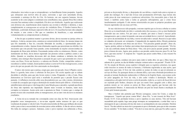 Se sua vida houvesse sido poupada , o mesmo espírito que os levara a rebelar-se contra Deus ter-se-ia manifestado em ódio e contenda entre eles mesmos , e ter-se-iam finalmente destruído uns aos outros . Foi por amor ao mundo , por amor a Israel e mesmo pelos transgressores , que o crime foi punido com uma severidade breve e terrível . Apercebendose o povo da enormidade de sua falta , o terror invadiu todo o arraial . Receava-se que todos os culpados devessem ser extirpados . Compadecido da angústia deles , Moisés prometeu mais uma vez pleitear com Deus em seu favor . “ Vós pecastes grande pecado ”, disse ele , “ agora , porém , subirei ao Senhor ; porventura farei propiciação por vosso pecado .” Ele foi , e em sua confissão diante de Deus disse : “ Ora , este povo pecou pecado grande , fazendo para si deuses de ouro . Agora , pois , perdoa o seu pecado , senão risca-me , peço-Te , do Teu livro , que tens escrito .” A resposta foi : “ Aquele que pecar contra Mim , a este riscarei Eu do Meu livro .