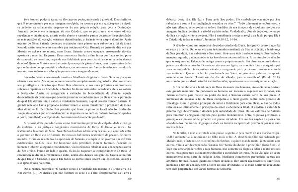 Se o homem pudesse tornar-se tão cego ao poder , majestade e glória do Deus infinito , que O representasse por uma imagem esculpida , ou mesmo por um quadrúpede ou réptil ; se pudesse de tal maneira esquecer-se de sua própria relação para com a Divindade , formado como é ele à imagem de seu Criador , que se prostrasse ante esses objetos repelentes e inanimados , estaria então aberto o caminho para a detestável licenciosidade ; as más paixões do coração estariam desenfreadas , e Satanás teria amplo domínio . Junto mesmo do Sinai Satanás começou a executar seus planos para subverter a lei de Deus , levando assim avante a mesma obra que iniciara no Céu . Durante os quarenta dias em que Moisés se achava no monte , com Deus , Satanás esteve ocupado provocando dúvida , apostasia e rebelião . Enquanto Deus escrevia a Sua lei , a fim de ser confiada ao Seu povo do concerto , os israelitas , negando sua fidelidade para com Jeová , estavam a pedir deuses de ouro ! Quando Moisés veio da terrível presença da glória divina , com os preceitos da lei que se haviam comprometido a obedecer , encontrou-os em franco desafio aos mandos da mesma , curvando-se em adoração perante uma imagem de ouro .