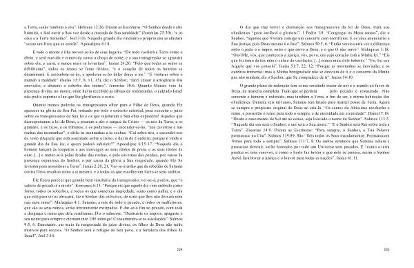 O dia que traz terror e destruição aos transgressores da lei de Deus , trará aos obedientes “ gozo inefável e glorioso ”. 1 Pedro 1:8 . “ Congregai os Meus santos ”, diz o Senhor , “ aqueles que fizeram comigo um concerto com sacrifícios . E os céus anunciarão a Sua justiça ; pois Deus mesmo é o Juiz ”. Salmos 50:5 , 6 . “ Então vereis outra vez a diferença entre o justo e o ímpio , entre o que serve a Deus , e o que O não serve ”. Malaquias 3:18 . “ OuviMe , vós , que conheceis a justiça , vós , povo , em cujo coração está a Minha lei .” “ Eis que Eu tomo da tua mão o cálice da vacilação ; [...] nunca mais dele beberás .” “ Eu , Eu sou Aquele que vos consola ”. Isaías 51:7 , 22 , 12 . “ Porque as montanhas se desviarão , e os outeiros tremerão ; mas a Minha benignidade não se desviará de ti e o concerto da Minha paz não mudará , diz o Senhor , que Se compadece de ti ”. Isaías 54:10 .