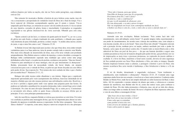 Não somente foi mostrada a Balaão a história do povo hebreu como nação , mas ele viu o crescimento e prosperidade do verdadeiro Israel de Deus até o final do tempo . Viu o favor especial do Altíssimo acompanhando aqueles que O amam e temem . Viu-os amparados pelo Seu braço , ao entrarem no escuro vale da sombra da morte . E viu-os saírem de seus túmulos , coroados de glória , honra e imortalidade . Contemplou os resgatados regozijando-se nas glórias imarcescíveis da Terra renovada . Olhando para esta cena , exclamou :