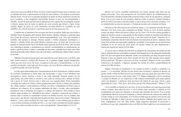 Moisés viu o povo escolhido estabelecido em Canaã , estando cada tribo em sua própria possessão . Teve uma perspectiva de sua história depois do estabelecimento na Terra Prometida ; estendeuse diante dele a história longa e triste de sua apostasia , e punição desta . Viu-os , por causa de seus pecados , dispersos entre os gentios , estando afastada a glória de Israel , em ruínas a sua bela cidade , e o povo desta cativo em terras estranhas . Viuos restabelecidos na terra de seus pais , e finalmente trazidos sob o domínio de Roma .