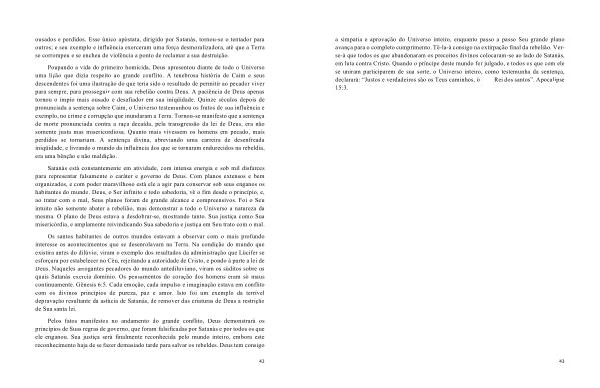 Satanás está constantemente em atividade , com intensa energia e sob mil disfarces para representar falsamente o caráter e governo de Deus . Com planos extensos e bem organizados , e com poder maravilhoso está ele a agir para conservar sob seus enganos os habitantes do mundo . Deus , o Ser infinito e todo sabedoria , vê o fim desde o princípio , e , ao tratar com o mal , Seus planos foram de grande alcance e compreensivos . Foi o Seu intuito não somente abater a rebelião , mas demonstrar a todo o Universo a natureza da mesma . O plano de Deus estava a desdobrar-se , mostrando tanto . Sua justiça como Sua misericórdia , e amplamente reivindicando Sua sabedoria e justiça em Seu trato com o mal .