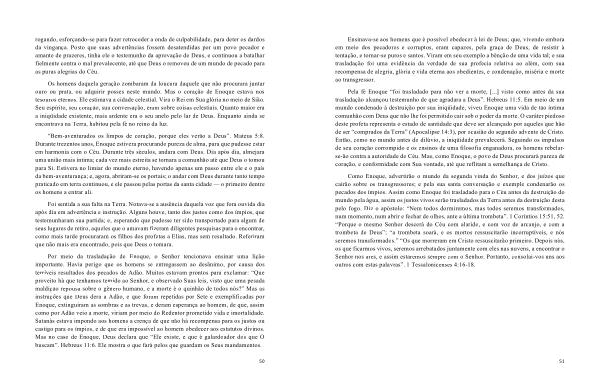 “ Bem-aventurados os limpos de coração , porque eles verão a Deus ”. Mateus 5:8 . Durante trezentos anos , Enoque estivera procurando pureza de alma , para que pudesse estar em harmonia com o Céu . Durante três séculos , andara com Deus . Dia após dia , almejara uma união mais íntima ; cada vez mais estreita se tornara a comunhão até que Deus o tomou para Si . Estivera no limiar do mundo eterno , havendo apenas um passo entre ele e o país da bem-aventurança ; e , agora , abriram-se os portais ; o andar com Deus durante tanto tempo praticado em terra continuou , e ele passou pelas portas da santa cidade — o primeiro dentre os homens a entrar ali .