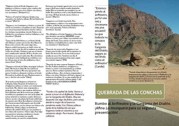 “A la tarde noche llegamos al hotel en Cafayate, Salta. Después de bañarnos y arreglarnos salimos a comer a un restaurante muy lindo. Nos dieron unas empanadas y después unos fideos que estaban deliciosos. Para disfrutar más de la noche que estaba increíble nos quedamos un rato en la plaza. Al volver al hotel no teníamos sueño. Entonces fuimos un rato a la pileta del hotel a disfrutar de nuestro rato libre. Escuchamos música (no tan fuerte porque había gente que dormía). Después de esto, con las chicas, nos fuimos a la habitación. Chiara y Agus se durmieron primero. En cambio Avril y yo nos pusimos a ver videos de nuestros ‘chinos’ jeje. Pasó algo muy gracioso mientras estábamos viendo videos. En un momento me quedé semidormida y la canción estaba fuerte. Entonces me levanté, agarré mis crocs y casi le pego a Avril que todavía estaba despierta jajaja. Ella no entendía que pasaba y yo caí tarde. Nos pusimos a reír y casi despertamos a las otras. Al final de todo ya nos fuimos a dormir.” (Meli Z.)
