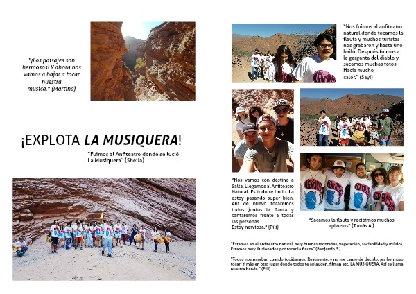 “Todos nos miraban cuando tocábamos. Realmente, y no me canso de decirlo, ¡es hermoso tocar! Y más en otro lugar donde todos te aplauden, filman etc. LA MUSIQUERA. Así se llama nuestra banda.” (Pili)