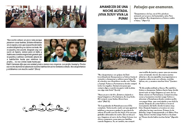 Fabri Carranza dijo que era verdad y más o menos nos creyeron. Los profes Juampi y Tincho esa noche durmieron afuera de nuestra habitación así no teníamos miedo. Nos despertamos y estábamos con mucho sueño” (Facu)
