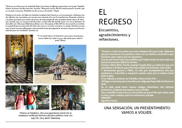 “Hicimos un cititour por la ciudad de Salta. Conocimos la iglesia y aparecimos en la tele. También fuimos al museo donde vimos las ‘momias’. Me gustó mucho. Me dio mucha pena la ‘momia’ que no se pudo conservar. También me dio un poco de miedo.” (Sayi)