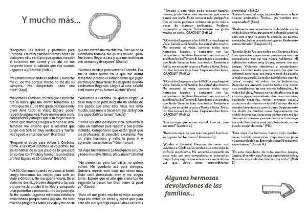 “Lo más lindo fue que todos nos llevamos bien. Creo que estos viajes sirven para unirse más con compañeros que tal vez nunca hablamos. Mi habitación estuvo muy buena, estuve con mis amigas. Vivíamos riéndonos y contándonos cosas. Lo único malo que me pasó fue que me enfermé, pero saco eso malo y traté de pasarla lo mejor que pude. Lo mejor del viaje fue cuando ‘cabra’ rompió el vidrio de la habitación. Después me encantó cuando todos a la noche nos juntábamos en una misma habitación… lo mejor del viaje. Aunque no nos dejaba y nos iban a buscar jajaja. La pasábamos bien esos minutos, haciendo tonterías, reírse, contarse cosas…¡todos nos dormíamos re tarde! Y al otro día nos costaba levantarnos, pero bueno. Seguramente me olvido de muchas cosas Seguramente me olvido de muchas cosas para contar pero me las llevo en mi corazón y en mi memoria. Este viaje fue todo. Realmente vine completa de ahí, no me puedo quejar de nada.” (Pili)