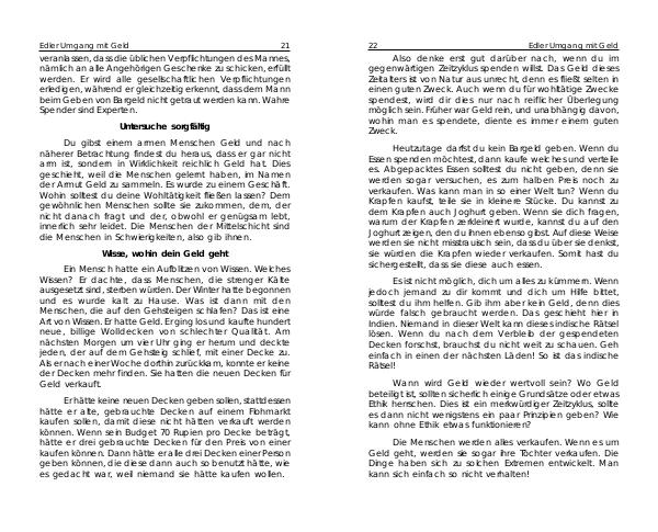 Es ist nicht möglich, dich um alles zu kümmern. Wenn jedoch jemand zu dir kommt und dich um Hilfe bittet, solltest du ihm helfen. Gib ihm aber kein Geld, denn dies würde falsch gebraucht werden. Das geschieht hier in Indien. Niemand in dieser Welt kann dieses indische Rätsel lösen. Wenn du nach dem Verbleib der gespendeten Decken forschst, brauchst du nicht weit zu schauen. Geh einfach in einen der nächsten Läden! So ist das indische Rätsel!