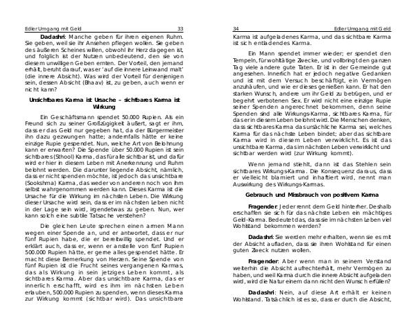 Ein Mann spendet immer wieder; er spendet den Tempeln, für wohltätige Zwecke, und vollbringt den ganzen Tag viele andere gute Taten. Er ist in der Gemeinde gut angesehen. Innerlich hat er jedoch negative Gedanken und ist mit dem Versuch beschäftigt, ein Vermögen anzuhäufen, und wie er dieses genießen kann. Er hat den starken Wunsch, andere um ihr Geld zu betrügen, und er begehrt verbotenen Sex. Er wird nicht eine einzige Rupie seiner Spenden angerechnet bekommen, denn seine Spenden sind alle Wirkungs-Karma, sichtbares Karma, für das er in diesem Leben belohnt wird. Die Menschen denken, dass sichtbares Karma das ursächliche Karma sei, welches Karma für das nächste Leben bindet; aber das sichtbare Karma wird in diesem Leben verwirklicht. Es ist das unsichtbare Karma, das im nächsten Leben verwirklicht und sichtbar werden wird( zur Wirkung kommt).