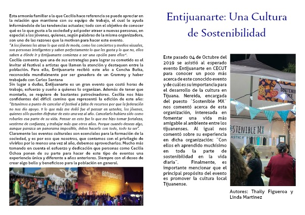 Sin lugar a dudas, Entijuanarte es un gran evento que costó horas de trabajo, esfuerzo y sueño a quienes lo organizan. Además de tener que montarlo, se requiere de bastantes patrocinadores. Cecilia nos hizo confidentes del difícil camino que representó la edición de este año: “Estuvimos a punto de cancelar el festival a falta de recursos por que la federación no nos dio apoyo. Y lo que más me dolió fue el pensar en ustedes, los jóvenes, quienes sólo pueden disfrutar de esto una vez al año. Cancelarlo hubiera sido como robarles esa parte de su vida. Pensar en esto fue lo que me hizo tomar fortaleza, vestirme de confianza, y trabajar más que otros años. Porque cuando deseas algo, aunque parezca un panorama imposible, debes hacerlo con todo, todo tu ser".