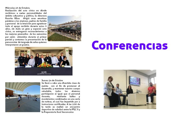 Se llevó a cabo una divertida clase de zumba con el fin de promover el desarrollo, y mantener nuestro cuerpo saludable, todos los alumnos participaron al igual que el personal docente, mediante bailes y movimientos combinados en una serie de rutinas, el cual fue impartido por 2 instructoras certificadas. A las 2:00 de la tarde se realizó un encuentro deportivo de voleibol entre la PFLC II y la Preparatoria José Vasconcelos