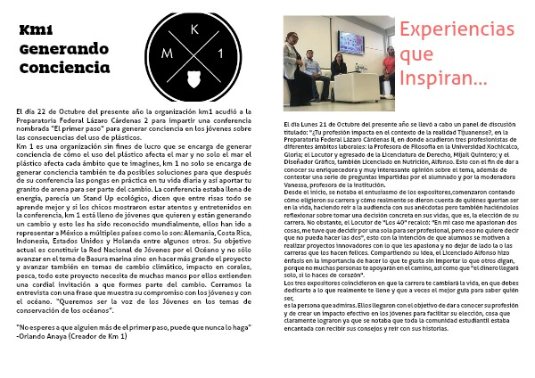 Km 1 es una organización sin fines de lucro que se encarga de generar conciencia de cómo el uso del plástico afecta el mar y no solo el mar el plástico afecta cada ámbito que te imagines, km 1 no solo se encarga de generar conciencia también te da posibles soluciones para que después de su conferencia las pongas en práctica en tu vida diaria y así aportar tu granito de arena para ser parte del cambio. La conferencia estaba llena de energía, parecía un Stand Up ecológico, dicen que entre risas todo se aprende mejor y si los chicos mostraron estar atentos y entretenidos en la conferencia, km 1 está lleno de jóvenes que quieren y están generando un cambio y esto les ha sido reconocido mundialmente, ellos han ido a representar a México a múltiples países como lo son: Alemania, Costa Rica, Indonesia, Estados Unidos y Holanda entre algunos otros. Su objetivo actual es constituir la Red Nacional de Jóvenes por el Océano y no sólo avanzar en el tema de Basura marina sino en hacer más grande el proyecto y avanzar también en temas de cambio climático, impacto en corales, pesca, todo este proyecto necesita de muchas manos por ellos extienden una cordial invitación a que formes parte del cambio. Cerramos la entrevista con una frase que muestra su compromiso con los jóvenes y con el océano. “Queremos ser la voz de los Jóvenes en los temas de conservación de los océanos”.