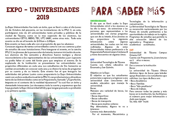 El día que se llevó acabo la Expo Universidades 2019 a los alumnos se les dio la tarea de entrevistar a las personas que representaban a las universidades con ciertas preguntas que son de su interés. A los jóvenes se les proporciono la siguiente información sobre algunas universidades, las cuales son las más codiciadas. Algunas de estas Universidades tienen preferencia a la Preparatoria Federal Lázaro Cárdenas II y tiene descuentos en algunas áreas.