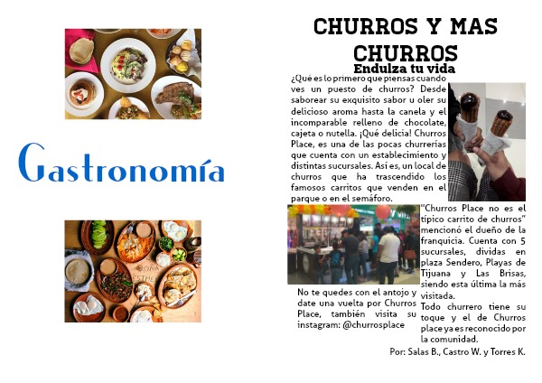''Churros Place no es el típico carrito de churros” mencionó el dueño de la franquicia. Cuenta con 5 sucursales, dividas en plaza Sendero, Playas de Tijuana y Las Brisas, siendo esta última la más visitada.