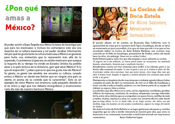 Al poder asistir a Expo Tequila nos dimos la tarea de investigar por que para los mexicanos o incluso los extranjeros esto era una muestra de la cultura mexicana y así poder recabar información del por qué les gusta tanto la cultura mexicana o México en general, pero hubo una entrevista que lo representó más allá de lo esperado, Cuauhtemoc López era un adulto mexicano que aunque la mayoría de su tiempo ha vivido en Estados Unidos ha podido amar a su país incluso en la distancia, ¿por qué amar México? A lo que el respondió: “¿sabes qué es lo que me gusta más de México? Su gente, su gente tan amable, me encanta su cultura, cuando entras a México se siente ese folclor que en ningún otra país se siente, el aroma de su comida que lo caracteriza”. Esto es un ejemplo de cómo México nos enamora, cada pequeño detalle en el es único y algo que nos debería enorgullecer y enamorarnos cada día más de nuestro hermoso México