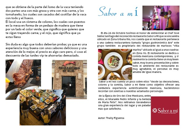 El día 26 de Octubre tuvimos el honor de entrevistar al Chef José Jaime Santiago del reconocido restaurante Sabor a Mí que se encuentra ubicado en Zona Urbana Río, nos cuenta que el restaurante pertenece a una cadena restaurantera llamada “grupo gastronómico Ara” este grupo también es propietario del restaurante de mariscos “villa marina” ubicado al igual a unas cuadras en Zona río.