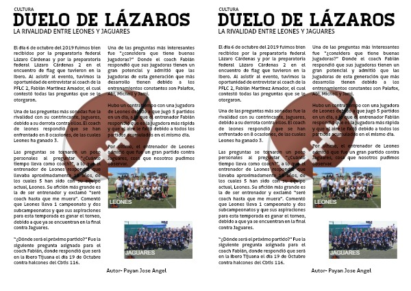 El día 6 de octubre del 2019 fuimos bien recibidos por la preparatoria federal Lázaro Cárdenas y por la preparatoria federal Lázaro Cárdenas 2 en el encuentro de flag que tuvieron en la Ibero. Al asistir al evento, tuvimos la oportunidad de entrevistar al coach de la PFLC 2, Fabián Martínez Amador, el cual contestó todas las preguntas que se le otorgaron.
