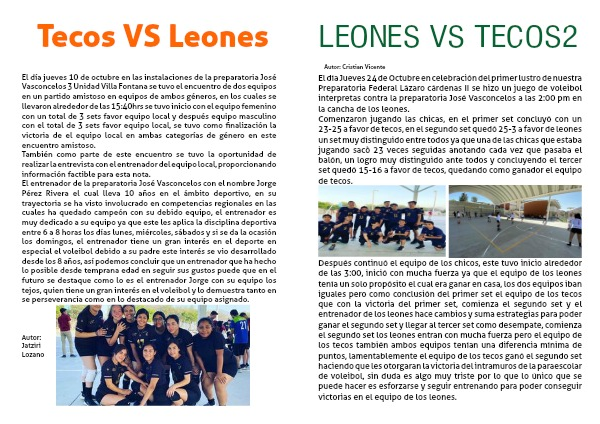 El día Jueves 24 de Octubre en celebración del primer lustro de nuestra Preparatoria Federal Lázaro cárdenas II se hizo un juego de voleibol interpretas contra la preparatoria José Vasconcelos a las 2:00 pm en la cancha de los leones.