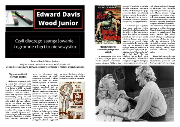 Niebywały ekscentryk, któ-ry przez lata ukrywał swój transeksualizm przed światem, by w końcu w 1953 r wyjawić prawdę w pełnometrażowym debiucie ''Glen or Glenda''. Obraz ten opowiada historię transwestyty, który raz jest Glenem, a raz Glendą w główną rolę wcielił się sam reżyser, nosząc na planie ukochane różowe swetry z angory, nylo-nowe pończochy oraz blond perukę. Film łączy w sobie cztery gatunki filmowe: soft-porno, dramat ,dokument oraz komedię. Produkcja z nieby-wale wielkimi ambicjami i wręcz nie istniejącym bud-żetem starający się nieść przesłanie tolerancji i akce-ptacji dla ludzi nie hete-ronormatywnych i transwe-stytów, którzy w tamtych czasach zamykani byli w zakładach dla obłąkanych. Niestety nawet ogromne zaan-gażowanie i wielkie serce re-żysera do projektu nie pomogły produkcji. Film okazał się niesamowicie kiczowaty a o-kropna realizacja,scenariusz i niepowalająca gra aktorska na czele z niezwykle irytującym Bela Lugosi który widocznie kolejny raz chciał poczuć się jak gwiazda na planie horroru Universalu i swym charakte-rystycznym, kompletnie nie pasującym głosem wygłaszał wyrwane z kontekstu teksty o smoku jedzącym małych chło-pców albo ciągnięciu sznurków.
