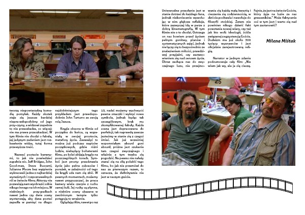 Nazwać postacie barwny-mi, to jak nie powiedzieć zupełnie nic. Jeff Bridges, John Good-man, Steve Buscemi, Julianne Moore bez wątpienia wykreowali jedne z najbardziej wyrazistych i rozpoznawalnych ról w świecie filmu. Aktorzy nie pozwalają nam wyobrazić sobie nikogo innego na ich miejscu. W niektórych przy-padkach nawet jedna czy dwie sceny wystarczają, aby dana postać zapadła w pamięć na długo: najdobitniejszym tego przykładem jest prawdopo-dobnie John Turturro ze swoją rolą Jezusa.