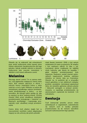 Czarna skóra tych płazów mogła być w rzeczywistości wynikiem reakcji adaptacyjnej mającej na celu ochronę żab przed uszkodzeniami tkanek , komórek i DNA , a tym samym zwiększenie ich szans na przeżycie . W związku z tym naukowcy odkryli , że żaby o najczarniejszej skórze znajdowały się najbliżej strefy wybuchu , gdy doszło do wypadku i gdzie skażenie promieniowaniem było najwyższe . Naukowcy szukali również potencjalnych negatywnych skutków nadmiaru melaniny na ciemne żaby po Czarnobylu . Okazało się , że podobnie jak w przypadku innych gatunków , w tym niektórych rodzajów grzybów , posiadanie ciemniejszej pigmentacji skóry nie szkodziło ogólnemu zdrowiu płazów i faktycznie pomagało w jonizacji promieniowania , co zapobiega przedostawaniu się zjonizowanych cząsteczek do komórek i ich uszkadzaniu .