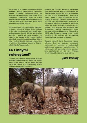Odkryto np . Że liczba wilków na tym terenie jest siedmiokrotnie wyższa niż w innych , nie radioaktywnych miejscach . W przeciwieństwie do tych dużych drapieżników i innej dużej fauny , owady i pająki odnotowały znaczny spadek liczebności . Badanie przeprowadzone w 2009 roku w Biology Letters wykazało , że im większe było promieniowanie w niektórych miejscach wokół obszaru katastrofy w Czarnobylu , tym mniejsza była populacja bezkręgowców . Podobne zjawisko miało miejsce po awarii elektrowni jądrowej w Fukushimie w 2011 roku . Populacje ptaków , cykad i motyli zmniejszyły się , podczas gdy na populacje innych zwierząt nie miało to wpływu .