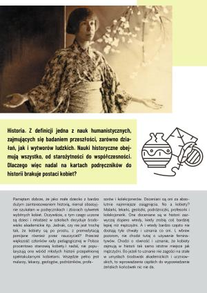 Historia . Z definicji jedna z nauk humanistycznych , zajmujących się badaniem przeszłości , zarówno działań , jak i wytworów ludzkich . Nauki historyczne obejmują wszystko , od starożytności do współczesności . Dlaczego więc nadal na kartach podręczników do historii brakuje postaci kobiet ?