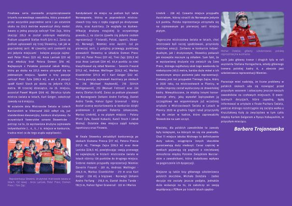 W finale Słoweńcy zmiażdżyli konkurencję po skokach Domena Prevca ( 217 m ), Petera Prevca ( 221 , 5 m ), Timiego Zajca ( 228 , 5 m ) oraz Anze Laniska ( 228 , 5 m ), powiększając swoją przewagę do największej w historii mistrzostw świata w lotach różnicy 128 punktów do drugiego miejsca . Srebrne medale przypadły reprezentacji Niemiec ( Severin Freund - 201 m , Andreas Wellinger - 206 , 5 m , Markus Eisenbichler - 213 m oraz Karl Geiger - 238 m ), a brązowe - Norwegii ( Johann Andre Forfang - 210 , 5 m , Daniel Andre Tande - 192 , 5 m , Halvor Egner Granerud - 222 m i Marius
