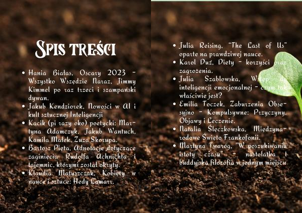 Julia Reising , “ The Last of Us ” oparte na prawdziwej nauce . Karol Duź , Diety - korzyści oraz zagrożenia . Julia Szablowska , Wstęp do inteligencji emocjonalnej - czym tak właściwie jest ? Emilia Toczek , Zaburzenia Obsesyjno - Kompulsywne : Przyczyny , Objawy i Leczenie . Natalia Ślęczkowska , Międzynarodowe Święto Frankofonii . Martyna Twaróg , ” W poszukiwaniu istoty czasu ” - nastolatka i buddyjska filozofia w jednym miejscu