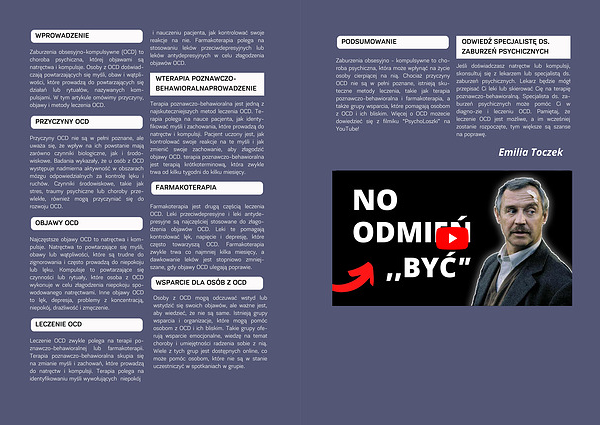 Leczenie OCD zwykle polega na terapii poznawczo-behawioralnej lub farmakoterapii . Terapia poznawczo-behawioralna skupia się na zmianie myśli i zachowań , które prowadzą do natręctw i kompulsji . Terapia polega na identyfikowaniu myśli wywołujących niepokój i nauczeniu pacjenta , jak kontrolować swoje reakcje na nie . Farmakoterapia polega na stosowaniu leków przeciwdepresyjnych lub leków antydepresyjnych w celu złagodzenia objawów OCD .