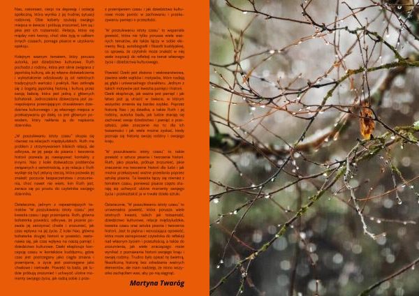 Ostatecznie , " W poszukiwaniu istoty czasu " to uniwersalna powieść , która porusza wiele istotnych kwestii , takich jak tożsamość , dziedzictwo kulturowe , relacje międzyludzkie , kwestia czasu oraz sztuka pisania i tworzenia historii . Jest to piękna i wzruszająca opowieść , która może zainspirować czytelnika do refleksji nad własnym życiem i przeszłością , a także do zrozumienia , jak wiele znaczącego może wynikać z poznawania historii swojego kraju i swojej rodziny . Trudno było opisać tę świetną , filozoficzną historię bez zdradzania ważnych elementów , ale mam nadzieję , że mimo wszystko zachęciłam was , aby po nią sięgnąć .