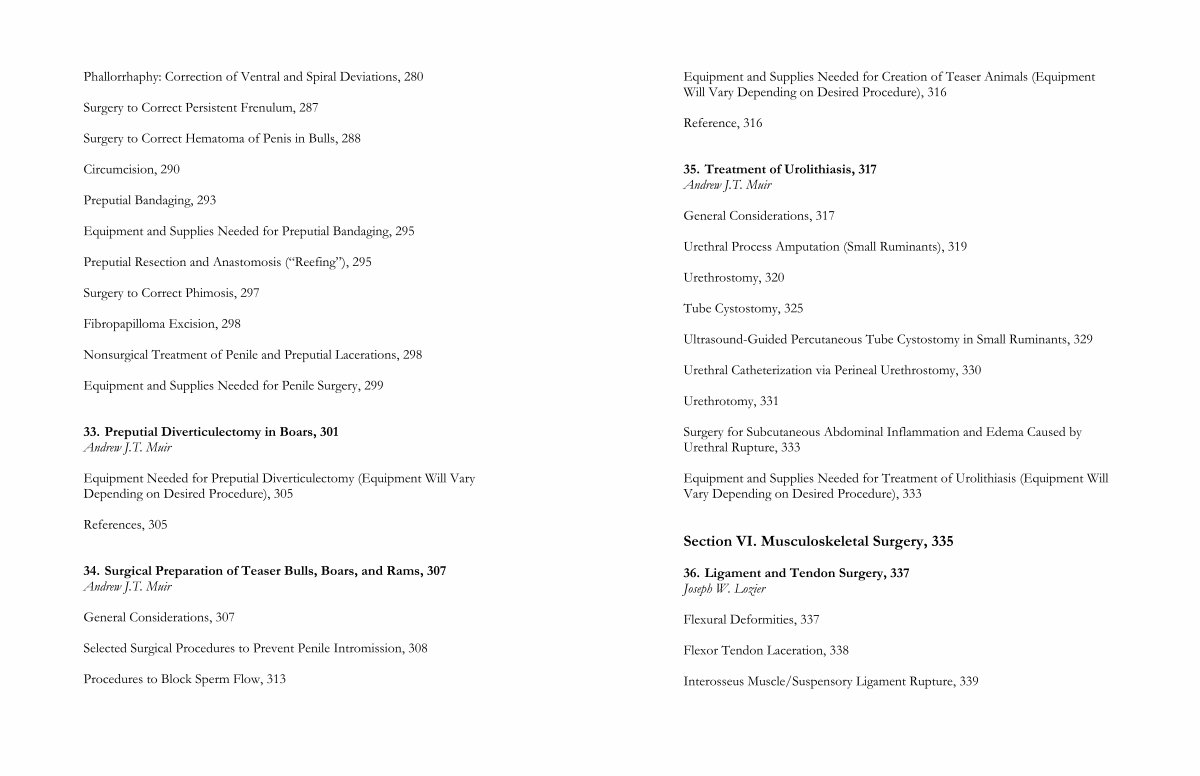 General Considerations, 317 Urethral Process Amputation( Small Ruminants), 319 Urethrostomy, 320 Tube Cystostomy, 325 Ultrasound-Guided Percutaneous Tube Cystostomy in Small Ruminants, 329 Urethral Catheterization via Perineal Urethrostomy, 330 Urethrotomy, 331