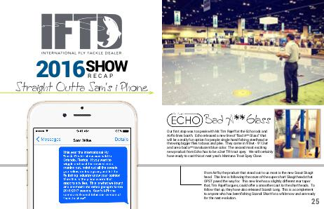 Our first stop was to speak with Mr. Tim Rajeff at the Echo rods and Airflo lines booth. Echo released a new line of“ Bad A ** Glass” that will be a really fun option for people single hand fishing steelhead or throwing bigger flies to bass and pike. They come in 9 ' 8wt- 9 ' 12wt and are a bad a ** translucent blue color. The second most exciting new product from Echo has to be a 3wt TR trout spey. We will certainly have ready to cast this at next year’ s Montana Trout Spey Clave.