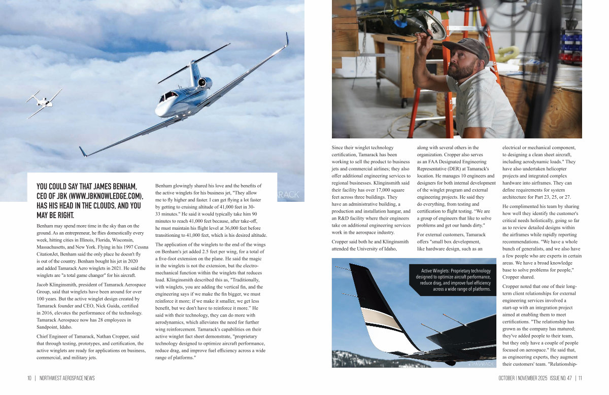 Jacob Klinginsmith, president of Tamarack Aerospace Group, said that winglets have been around for over 100 years. But the active winglet design created by Tamarack founder and CEO, Nick Guida, certified in 2016, elevates the performance of the technology. Tamarack Aerospace now has 28 employees in Sandpoint, Idaho.
