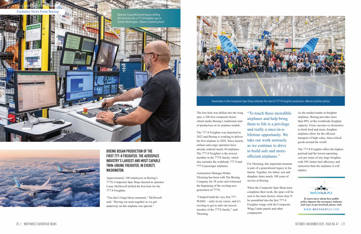 Approximately 100 employees at Boeing’ s 777X Composite Spar Shop cheered as operator Casey McDowell drilled the first hole for the 777-8 Freighter.