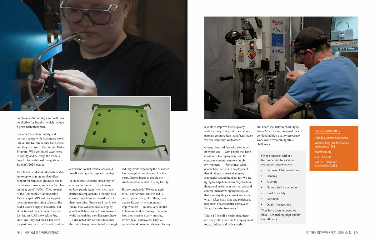 Boyce concluded,“ We are grateful for all our partners, and Firland is no exception. They, like others, have a great Kaizen— or continuous improvement— culture, very similar to how we work at Boeing. I’ ve seen how they make it a daily practice, involving all employees. They’ ve updated workflows and changed factory