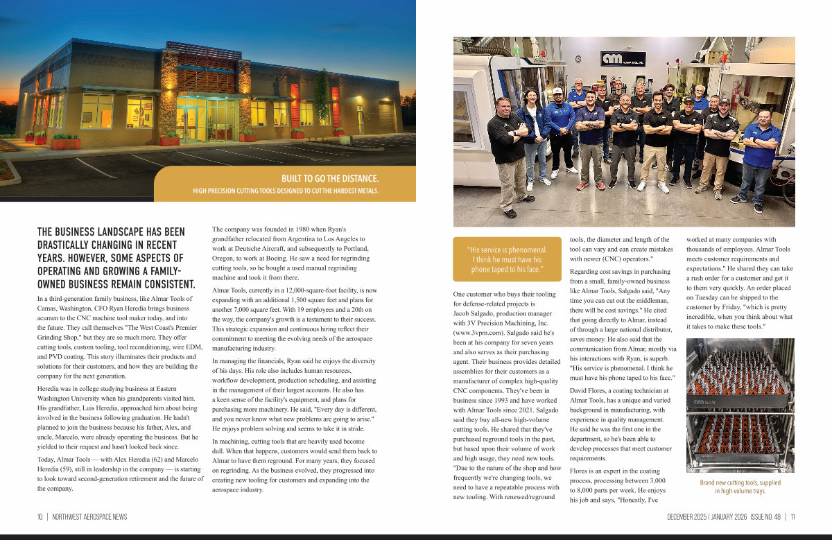 One customer who buys their tooling for defense-related projects is Jacob Salgado, production manager with 3V Precision Machining, Inc.( www. 3vpm. com). Salgado said he ' s been at his company for seven years and also serves as their purchasing agent. Their business provides detailed assemblies for their customers as a manufacturer of complex high-quality CNC components. They ' ve been in business since 1993 and have worked with Almar Tools since 2021. Salgado said they buy all-new high-volume cutting tools. He shared that they ' ve purchased reground tools in the past, but based upon their volume of work and high usage, they need new tools. " Due to the nature of the shop and how frequently we ' re changing tools, we need to have a repeatable process with new tooling. With renewed / reground