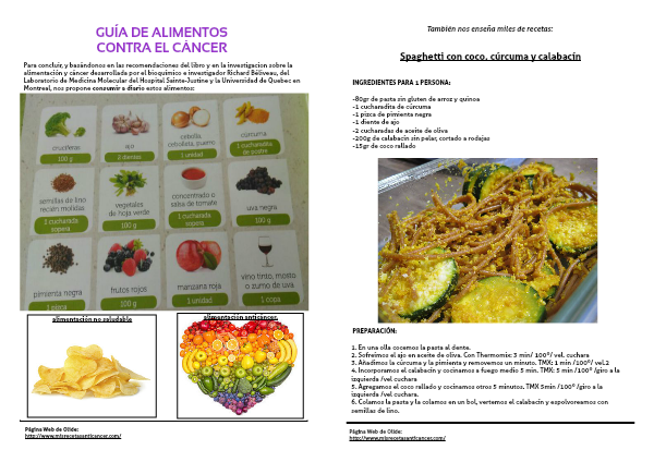Para concluir, y basándonos en las recomendaciones del libro y en la investigacion sobre la alimentación y cáncer desarrollada por el bioquímico e investigador Richard Béliveau, del Laboratorio de Medicina Molecular del Hospital Sainte-Justine y la Universidad de Quebec en Montreal, nos propone consumir a diario estos alimentos: