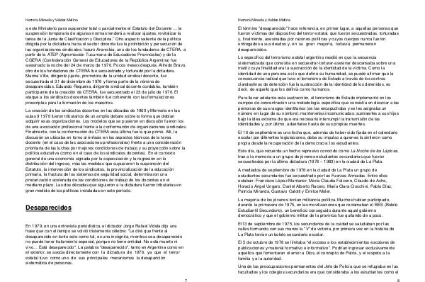 a este Ministerio para suspender total o parcialmente el Estatuto del Docente … la suspensión temporaria de algunas normas tenderá a realizar ajustes, revitalizar la tarea de la Junta de Clasificación y Disciplina.” Otro aspecto saliente de la política dirigida por la dictadura hacia el sector docente fue la prohibición y persecución de las organizaciones sindicales. Isauro Arancibia, uno de los fundadores de CTERA, a partir de la ATEP( Agremiación Tucumana de Educadores Provinciales) y de la CGERA( Confederación General de Educadores de la República Argentina) fue asesinado la noche del 24 de marzo de 1976. Pocos meses después, Alfredo Bravo, otro de los fundadores de CTERA fue secuestrado y torturado por la dictadura. Marina Vilte, dirigente jujeña, promotora de la unidad sindical docente, fue secuestrada el 31 de diciembre de 1976 y forma parte de la nómina de desaparecidos. Eduardo Requena, dirigente sindical docente cordobés, también participante de la creación de CTERA, fue secuestrado el 23 de julio de 1976. El ataque a los sindicatos docentes también fue coherente con las formulaciones prescriptas para la formación de los maestros.
