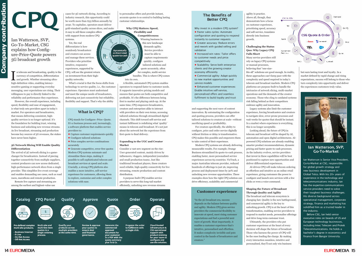 “ In the 5G broadcast era, success depends on the balance between quality and agility. Modern CPQ gives service providers the commercial flexibility to innovate at speed, meet rising customer expectations and fuel a powerful next wave of growth. Most importantly, it enables a customer experience that’ s intuitive, personalised and effortless. It makes complexity invisible and puts control in the hands of broadcasters and creators.” agility in practice. Above all, though, they demonstrate how a focus on customer experience, prioritising speed, accuracy and self-service, translates directly into business growth.