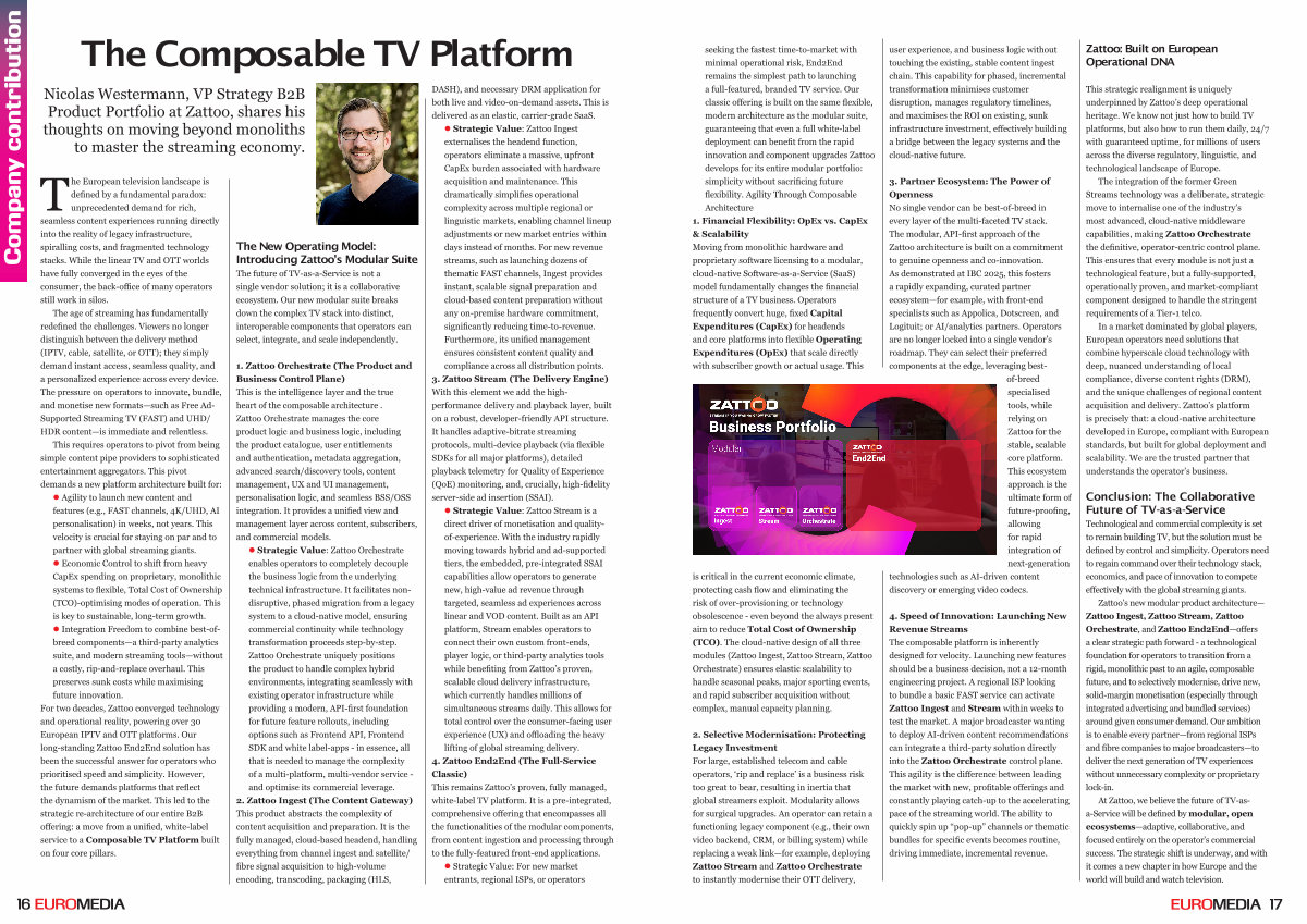 Zattoo’ s new modular product architecture— Zattoo Ingest, Zattoo Stream, Zattoo Orchestrate, and Zattoo End2End— offers a clear strategic path forward- a technological foundation for operators to transition from a rigid, monolithic past to an agile, composable future, and to selectively modernise, drive new, solid-margin monetisation( especially through integrated advertising and bundled services) around given consumer demand. Our ambition is to enable every partner— from regional ISPs and fibre companies to major broadcasters— to deliver the next generation of TV experiences without unnecessary complexity or proprietary lock-in.