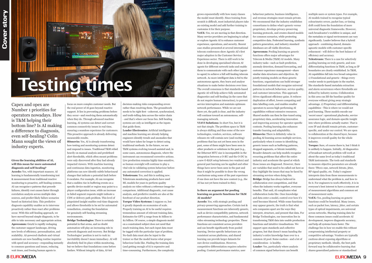 8 EUROMEDIA focus on more complex customer needs. But the real power of AI goes beyond reactive support. It lies in preventing problems before they occur— and resolving them automatically when they do. Through advanced machine learning, AI systems can detect and correct common connectivity issues in real time, ensuring a seamless experience for customers. This proactive approach is already delivering measurable results. Bitmovin: Yes, AI is already transforming how testing and monitoring systems detect and respond to issues. Traditional T & M relied heavily on manual analysis and predefined alert thresholds, which often meant problems were only discovered after they had already impacted viewers. With machine learning and continuous data ingestion, monitoring platforms can now identify subtle behavioural changes that indicate a potential fault before it escalates. For example, AI can recognise that a sudden rise in buffering events on a specific device model or region may point to a player configuration issue, while an increase in failed segment requests might indicate a CDN or delivery path problem. This level of pinpointed insight enables real-time diagnosis and allows thresholds to be set for automated remediation, creating the foundation for genuinely self-healing streaming environments. Bridge Technologies: There is certainly potential in that arena, and no doubt automation will play an increasing role in network diagnosis and recovery. But Bridge Technologies’ position is not to rush in: inevitability doesn’ t mean immediacy. AI will absolutely find its place within monitoring, but we believe that foundations come before fanfare. Without integrity of data, AI-led decision-making risks compounding errors rather than resolving them. The groundwork needs to be right first- coherent, synchronised, and truth-telling data across the entire chain- and that’ s where our focus lies. Self-healing systems are only as intelligent as the inputs that guide them. Leader Electronics: Artificial intelligence and machine learning are already helping engineers identify trends and anomalies that would have taken far longer to detect using traditional methods. In the future, we see T & M systems evolving toward assisted and, in some cases, autonomous diagnosis, where the instrument can recommend corrective actions. Live production remains highly time-sensitive, so human oversight will continue to play a vital role in validating system behaviour before any automated correction is applied. Telestream: Yes, and this is nothing new. Telestream monitoring products have used ML models for years to perform quality analysis on video without a reference image for comparison. Additional diagnostic, root cause analysis, and predictive models are also at the forefront of our product direction. Torque Video Systems: I suppose so, but it greatly depends on economies of scale. Properly training an AI to be useful requires tremendous amount of relevant training data. Estimates for GPT-5 range from $ 1 billion to $ 2 billion. Of course, a simple diagnosis model on a constrained subject does not need that much training data, but each input data must be tagged with the particular type of problem. No-fault data must also be input to the trainer so that the model learns what proper behaviour looks like. Finding the training data( and getting enough of it) is expensive and time-consuming. Furthermore, the complexity