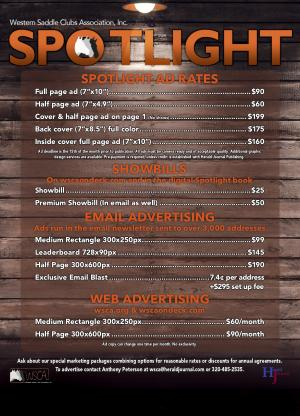 SPOTLIGHT AD RATES Full page ad ( 7 ” x10 ”) .................................................................$ 90 Half page ad ( 7 ” x4.9 ”) ...............................................................$ 60 Cover & half page ad on page 1 ( No shows ) ................................... $ 199 Back cover ( 7 ” x8.5 ”) full color ................................................. $ 175 Inside cover full page ad ( 7 ” x10 ”) ........................................... $ 160