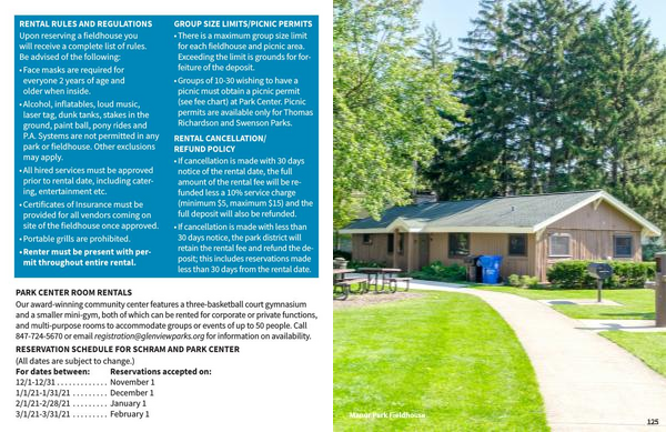 PARK CENTER ROOM RENTALS Our award-winning community center features a three-basketball court gymnasium and a smaller mini-gym , both of which can be rented for corporate or private functions , and multi-purpose rooms to accommodate groups or events of up to 50 people . Call 847-724-5670 or email registration @ glenviewparks . org for information on availability .