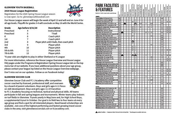 B , D • S 2.08 • • 318 Countryside Park , 3600 Countryside Ln . ( 12 ) 4.0 • 1 • . 3 • 9 * Catherine W . Crowley Park , 749 Huber Ln . ( 13 ) 10.5 • 2 T 1 B • 2 . 5 21 • 30 50 * Cunliff Park , 540 Echo Ln . ( 36 ) 10.0 • 4 T 1 • • 39 • 30 50 Diederich Park , 1 Briar Rd ., Golf ( 34 ) 3.8 • 2 T 1 • • 7 • 30 30 * Flick Park , 3600 Glenview Rd . ( 10 ) 39 • 4 T 1 • • S , F 4 1.5 • 310 • 30 100 * Fuller Air St . Prairie / Tyner Cnt ., 2400 Compass Rd . ( 47 ) 32 • 0 * Gallery Park , 2001 Patriot Blvd . ( 46 ) 60 • 5 T 1.8 • 500 * Glenview Ice Center , 1851 Landwehr Rd . ( 6 ) 5.0 240 • * Glenview Park Golf Club , 800 Shermer Rd . ( 1 ) 110 195 Glenview Prairie Club , 2800 W . Lake Ave . ( 40 ) 39.3 6PT 93 * Glenview Tennis Club , 1800 Wagner Rd . ( 33 ) 2.0 8 T 50 • * The Grove , 1421 Milwaukee Ave . ( 8 ) 143 • 3.1 • 68 • Hawthorne Glen Park , 3181 Myrtle Parkway ( 2 ) 7.5 • 2 T 1 • • 12 Indian Ridge Park , 2504 Indian Ridge Dr . ( 1 ) 5.0 • 2 T 1 • 0 Indian Trail Park , 1519 Forest Dr . ( 7 ) 5.2 • 2 T 1 • • 16 • 30 50 Jackman Park , 1930 Prairie St . ( 22 ) 1.9 • • 0 Jennings Park , 3201 Barbara Dr . ( 4 ) 5.0 • 1 • 0 * Johns Park , 2101 Central Rd . ( 29 ) 8.7 • 5T 1 • F 50 • 48 100 Judy Beck Park , 735 Carriage Hill ( 27 ) 3.9 • 1 • . 25 • 14 Ladendorf Park , 2541 Harrison St . ( 31 ) 3.5 • 1 • . 2 • 6 • 30 30 Manor Park , 200 Lincoln ( 30 ) 3.0 • 1 • . 2 • 0 • 30 30 * Park Center , 2400 Chestnut Ave . ( 38 ) 10.1 • • 3 • 500 • Park / Facility Services ( E ), 1100 Roosevelt Ave . ( 21 ) 2.7 N / A * Park / Facility Services ( W ), 655 Zenith Dr . ( 48 ) 4.5 N / A Peninsula Plygd , So . of 1950 Westleigh Dr . ( 44 ) 2.5 • • 0 * Roosevelt Park , 2200 Grove St . ( 20 ) 11.5 • • 3 T 1 • • F • 76 • 30 50 Rugen Park , 2941 Harrison St . ( 18 ) 6.0 • 3 T 1 • 3 • 12 • 30 30 * Schram Memorial Chapel , 1799 Patriot Blvd . ( 41 ) 1.0 • 0 • Sleepy Hollow Park , 1821 Maplewood Ln . ( 24 ) 7.5 • • • 20 • 30 50 * Swenson Park , 901 Shermer Rd . ( 16 ) 10.0 8 • 1 • S . 5 • 70 Tall Trees Park , 1421 Sequoia Trail ( 23 ) 4.5 • 1 • • 0 * Thomas Richardson Park , 1950 Westleigh Dr . ( 43 ) 10 • 2 T 1 • 2 1.65 • 41 * Wagner Farm , 1510 Wagner Rd . ( 39 ) 18.8 • 80 • Willow Park , 2600 Greenwood Rd . ( 3 ) 7.5 • 3 T . 7 29 • 48 50